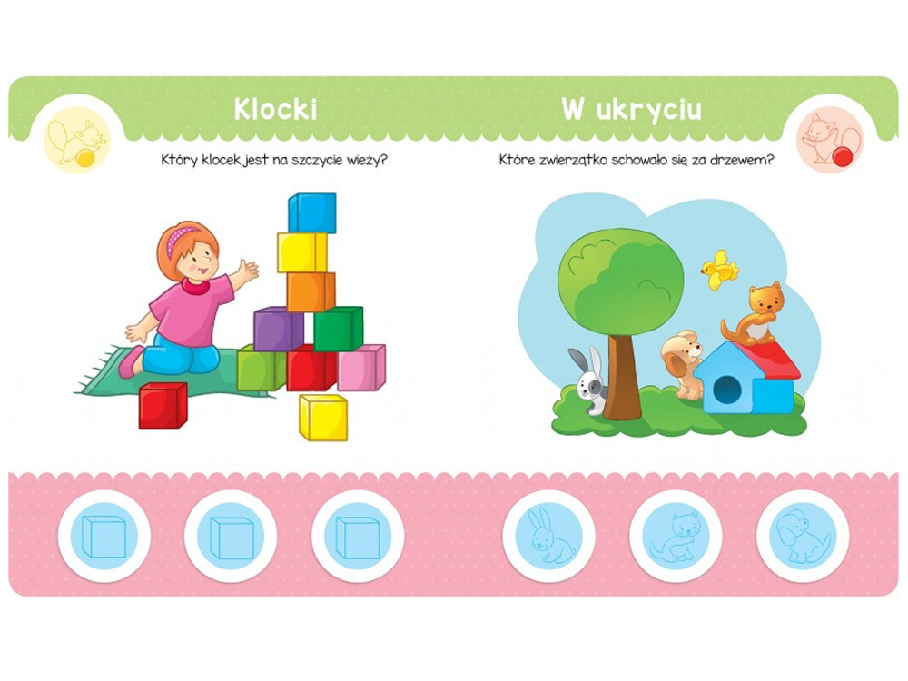 Dziecko odpowiada na proste pytania, wybiera odpowiednią naklejkę i przykleja ją w wyznaczone miejsce. Kolor piłeczki obok wiewiórki w górnym rogu strony podpowiada, która odpowiedź jest prawidłowa!