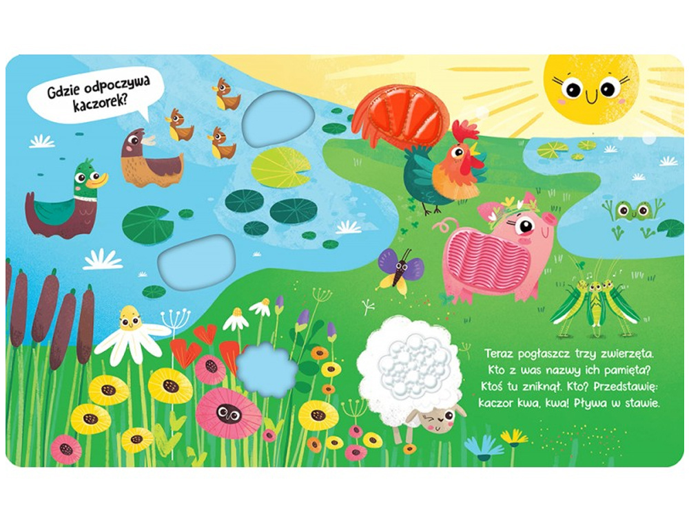 Ta pięknie ilustrowana książeczka to nie tylko pierwsza lektura – to mała wyprawa na wieś, podczas której dziecko poznaje zwierzęta z zagrody i ich zwyczaje. W środku czekają silikonowe wstawki o różnych fakturach, które pobudzają zmysł dotyku i zachęcają do aktywnego odkrywania każdej strony.