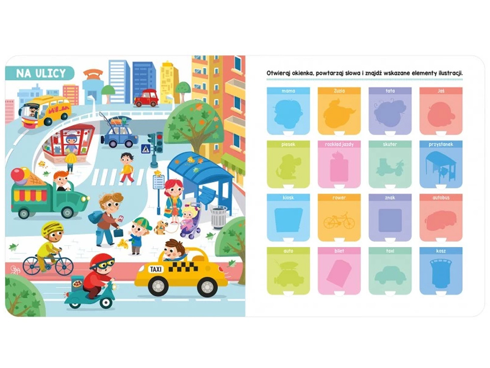 Z tą interaktywną książeczką maluch wyruszy na spacer po mieście, odkrywając słowa związane z codziennym życiem i miejskim otoczeniem. Każda strona skrywa ruchome okienka, a za nimi – kolorowe ilustracje i niespodzianki, które zachęcają do wspólnej zabawy i nauki.