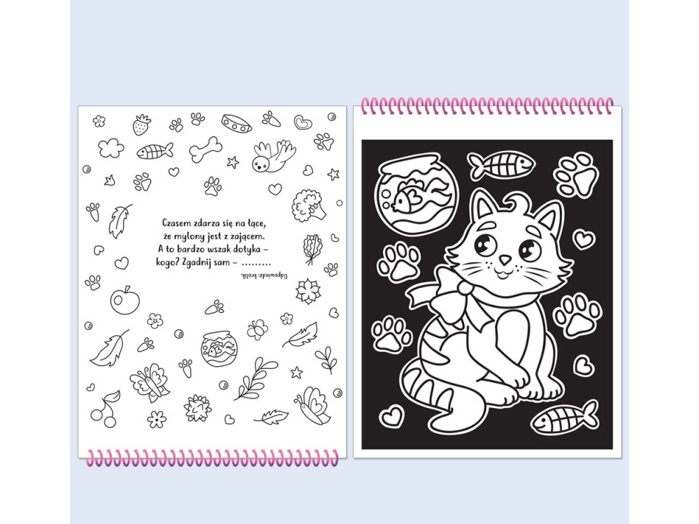 Ta wyjątkowa kolorowanka z czarnym welurem to idealna zabawa dla małych miłośników zwierząt. Miękkie tło nie tylko ułatwia precyzyjne kolorowanie, ale także stymuluje zmysł dotyku i wspiera rozwój małej motoryki.