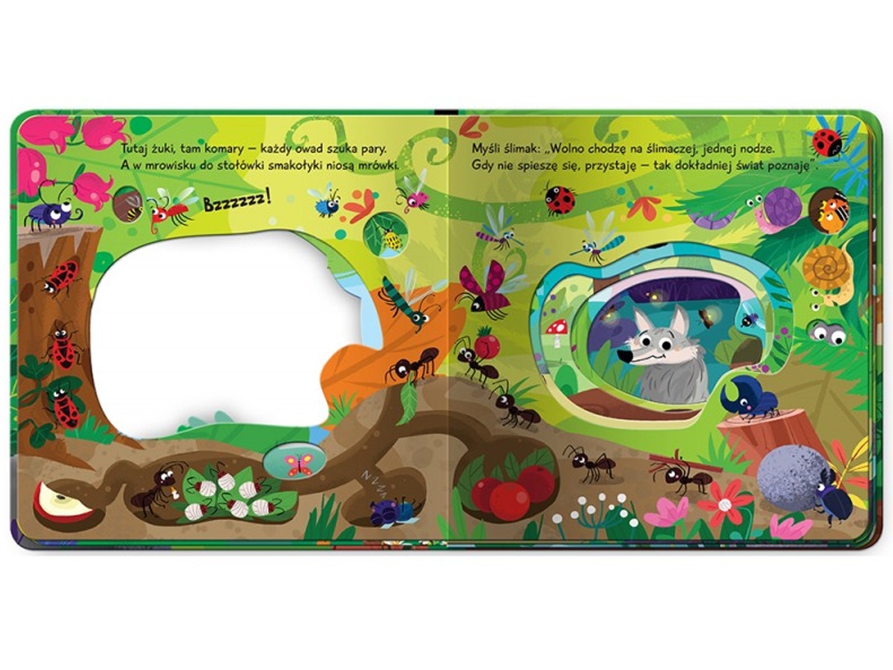 Dzięki otworom w stronach maluchy mogą zaglądać dalej, wypatrując oczu, dziobów czy łapek i zgadywać, do jakiego zwierzaka należą. W książce spotkamy m.in. dziki, wilki, bobry, sójkę, łosia czy nietoperze.