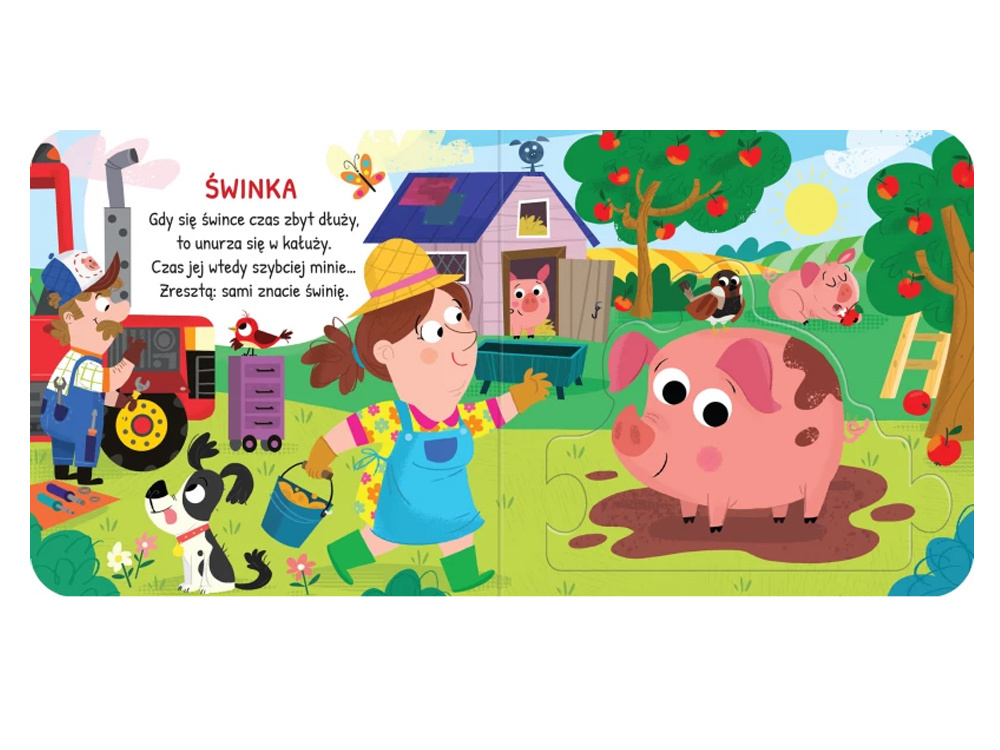 Integralną częścią książeczki są wyjmowane, duże puzzle, które rozwijają małą motorykę, koordynację ręka–oko i logiczne myślenie. Dziecko może dopasowywać elementy do ilustracji lub układać je samodzielnie, tworząc własne kompozycje. Co ważne, puzzle z tej książeczki można łączyć z elementami z pozostałych części serii, co daje jeszcze więcej możliwości zabawy i nauki.