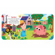 Na kartach książki pojawiają się dobrze znane mieszkańcy wiejskiego podwórka: owieczka, konie, kaczki, świnki, pies, krowy, kot, kogut, kury, żaby i bocian. Dzięki temu maluch poznaje świat zwierząt w bliski mu i przystępny sposób.