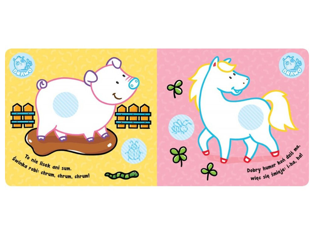Książeczka została zaprojektowana tak, by bawić się z maluchem oraz rozwijać jego umiejętności. Znajdziemy w niej krótkie wierszyki, 32 kolorowe naklejki oraz papierową zabawkę do samodzielnego złożenia.