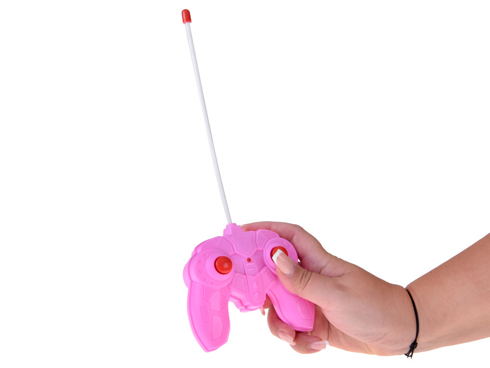 Pojazd sterowany jest prostym pilotem z dwoma przyciskami, który umożliwia jazdę do przodu, do tyłu oraz skręcanie w lewo i prawo. Podczas jazdy w przód samochodzik efektownie świeci reflektorami, co dodaje zabawie realizmu.