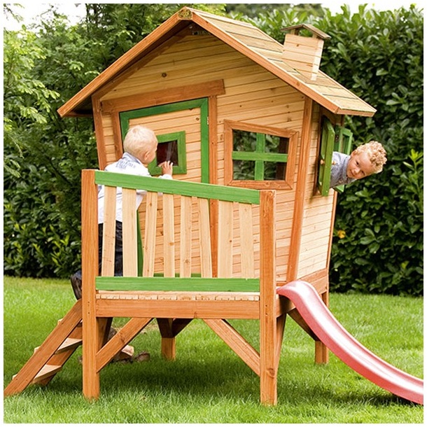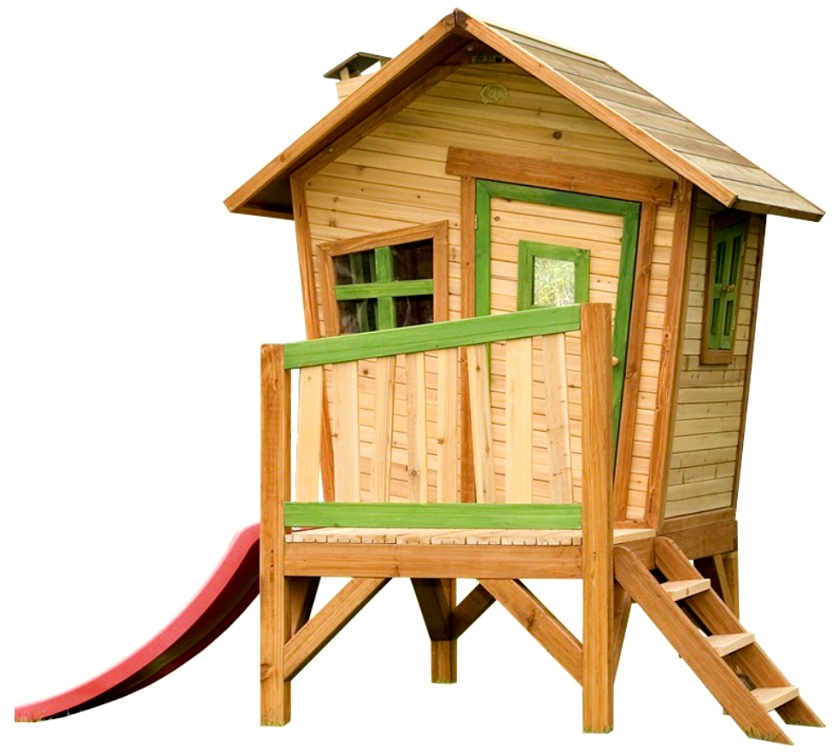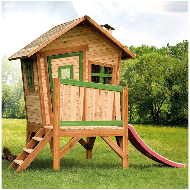 - Kinderhaus auf Stelzen mit Treppe, Veranda und kleiner roter Rutsche