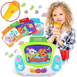 Interaktywny odtwarzacz muzyki z mikrofonem i funkcją karaoke. Zestaw zawiera 8 kart muzycznych, które po umieszczeniu w odtwarzaczu pozwalają na uruchomienie wersji oryginalnej lub instrumentalnej wybranej piosenki. Karty wyposażone są w strefy interaktywne - naciśnięcie ich odtworzy dodatkowy efekt dźwiękowy. Specyfikacja: wymiary: 25x23x5cm odtwarzacz z uchwytem na mikrofon mikrofon 8 kart - utworów - każda w 2 wersjach muzycznych (ze słowami i bez) oraz ze strefami interaktywnymi strefy interaktywne na karta regulacja głośności światła funkcja nagrywania zasilanie: 4xAA (brak w zestawie) Zabawka przeznaczona dla dzieci powyżej 3 roku życia.