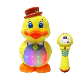 Interaktywna kaczka z mikrofonem to przenośny zestaw karaoke. Podczas odtwarzania piosenek zapalają się różnokolorowe światła. Cechy produktu - kaczka zasilana bateryjnie lub z kabla micro usb - wgrane utwory na mini dysk ok. 120MB - możliwość śpiewania do odtwarzanych utworów - zmiana brzmienia głosu - możliwość użycia kaczki jako głośnika po podłączeniu do odtwarzacza kablem miniJack 3,5mm - zasięg zestawu ok. 10m. - kaczka świeci się rożnokolorowym świałem w rytm muzyki ( możliwość wył.) - dodane efekty publiczności - instrukcja w j. polskim Zasilanie Kaczka 4x 1,5v AA lub poprzez kabel micro usb Mikrofon 3x 1,5V AAA Kabel miniJack-miniJack 3,5mm w zestawie. Wymiary: kaczka 28x17x17cm mikrofon śr.69mm, dł. 17cm Waga 580g - ilość w kartonie: 8 szt.