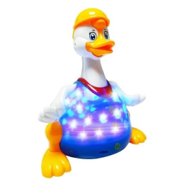 Tańcząca wesoła kaczka. Po uruchomieniu zabawki kaczka zaczyna tańczyć po płaskiej powierzchni poruszając skrzydłami, nogami oraz głową. Muzyce towarzyszą kolorowe światła znajdujące się na brzuchu kaczki. Po napotkaniu przeszkody, kaczka odbija się od niej i jedzie w przeciwnym kierunku. Specyfikacja: zasilanie bateryjne: 3xAA (brak w zestawie) ruchome skrzydła, nogi, głowa zabawka odbija się od przeszkód kolorowe światła i wesoła piosenka wymiary: 18x14x22cm Zabawka przeznaczona dla dzieci powyżej 18 miesiąca życia. Ilość szt. w kartonie: 48 Ilość szt. na palecie: 144