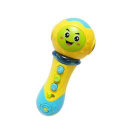 Dziecięcy mikrofon interaktywny z efektami dźwiękowymi oraz świetlnymi. Oprócz funkcji standardowego mikrofonu, zabawka odtwarza wesołe melodie oraz aplauz. Specyfikacja: kolor: żółty zasilanie bateryjne: 3xAA (brak w zestawie) wymiary: 7x7x18cm funkcja mikrofonu przycisk aplauzu/śmiechu funkcja instrumentu - machnięcie zabawką odtwarza dźwięki instrumentów kolorowe światła kilkanaście wesołych melodii możliwość śpiewania z akompaniamentem. Zabawka nieodpowiednia dla dzieci poniżej 18 miesiąca życia. Ilość szt. w kartonie: 96