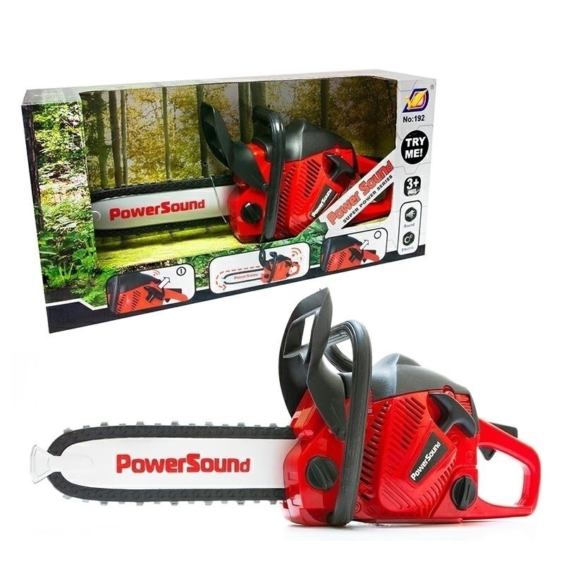 Piła motorowa - zabawka małego drwala. Uruchomienie piły następuje po lekkim pociągnięciu za linkę od rozrusznika, znajdującą się z lewej strony. Po usłyszeniu realistycznego dźwięku rozruchu, należy, trzymając piłę za rączkę, wcisnąć przycisk wprawiający łańcuch piły w ruch. Zasilanie: bateria AA 1,5 V x 3 (brak w zestawie). Kolorowe opakowanie wymiary: 37cm x 10cm x15cm waga: 272g ilość w kartonie: 24szt. Ilość szt. na palecie: 116 Zabawka nieodpowiednia dla dzieci poniżej 3 roku życia. Ilość szt. na palecie: 150