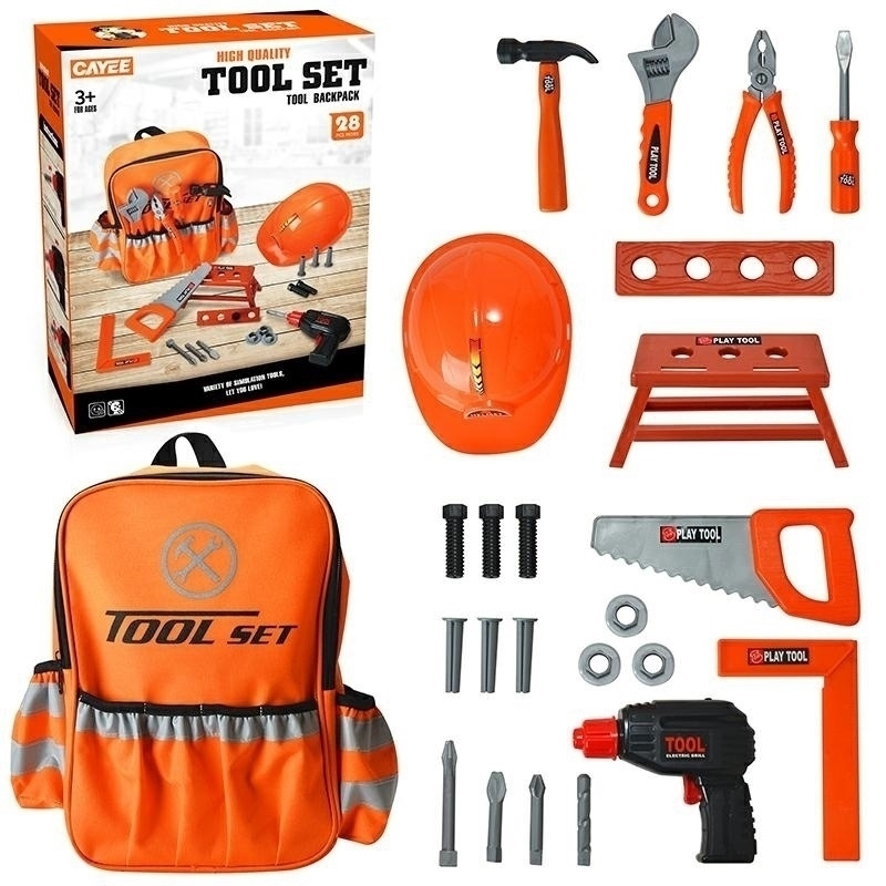 Wspaniały zestaw dla każdego młodego majsterkowicza. Zestaw zawiera wszystko, co jest niezbędne aby mógł wkręcać, mierzyć i piłować. Wkrętarka posiada wymienne koncówki. zasilanie piły: 2xAA 1.5V (brak w zestawie) W zestawie: - piła ręczna - kask - śrubokręt (+ 3 końcówki) - stolik + deska z otworami - klucz nastawny - młotek - śruby i nakrętki - kombinerki - kątownik - plecak 20x30x10cm wymiary opakowania: 24x31x11cm Zabawka przeznaczona dla dzieci powyżej 3 roku życia.