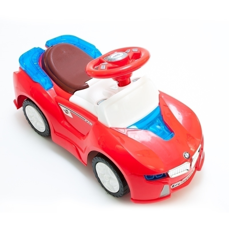 Samochód - jeździk. Urządzenie wspierające rozwój dziecka, pozwalające ćwiczyć koordynację ruchową. Wyposażony w specjalny schowek pod siedzeniem. Zabawie towarzyszą wesołe melodie sterowane guzikami na kierownicy. Samochód napędzany siłą mięśni. Zasilanie - 3 x bateria AAA (brak w zestawie). Dane techniczne: - długość ok. 68 cm - wysokość całkowita 38 cm - wysokość do siedziska 28 cm - szerokość 31 cm - max. obciążenie 30 kg - przystosowany dla dzieci w wieku 18 m+