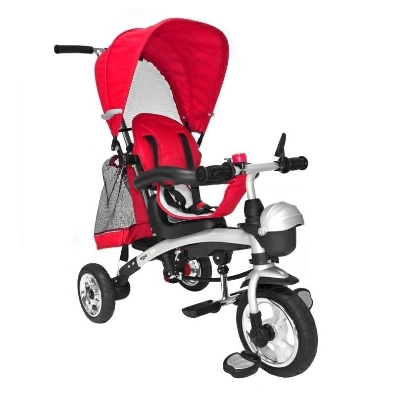 Rowerek dziecięcy trójkołowy 5w1. Możliwość dowolnej konfiguracji sprawia, że jeden rowerek może służyć za kilka różnych urządzeń, m.in. tradycyjny rower trójkołowy, rowerek biegowy, wózek spacerowy z baldachimem, rowerek tradycyjny z baldachimem, spacerowy rowerek z uchwytem itp. Cechy produktu: - posiada regulowany uchwyt z tyłu do prowadzenia i sterowania rowerkiem - lekki - wytrzymała konstrukcja - antypoślizgowe rączki - wygodne siedzisko - pompowane koła na łożyskach - błotnik przedni - blokada tylnych kół oraz kierownicy - max. obciążenie - 25 kg - 3 punktowe pasy bezpieczeństwa - podnóżek - rozkładany baldachim - przypinana torba na drobiazgi - lusterko oraz dzwonek przy kierownicy - zamykany bagażnik z przodu Wszelkie elementy pomocnicze typu uchyt, pasy bezpieczeństwa, podnóżek można łatwo zdemontować. Wymiary: długość - 90 cm wysokość - 95 cm wysokość od podłoża do siedziska - 35 cm śr. koła tylnego 20cm śr. koła przedniego 25cm Rowerek przeznaczony dla dzieci powyżej 18 miesiąca życia waga: 10kg