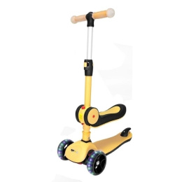 Hulajnoga trójkołowa 2w1 ze składanym siedziskiem. Możliwość jazdy na stojąco jak na tradycyjnej hulajnodze oraz na siedząco. Cechy produktu: - lekki - materiał wykonania: aluminium oraz tworzywo sztuczne - antypoślizgowe rączki - wygodne składane siedzisko - wysokość siedziska od ziemi: 26cm - kauczukowe koła - diody LED wbudowane w koła świecące podczas jazdy - hamulec przy tylnym kole - regulowana wysokość kierownicy - 62/73/78/83cm - maksymalne obciążenie: 50kg - przednie koło: 12x4cm - tylne koło: 8x3cm - dł. całkowita: 56cm - sz. całkowita 26cm Hulajnoga przeznaczona dla dzieci powyżej 3 roku życia waga: 3,4kg