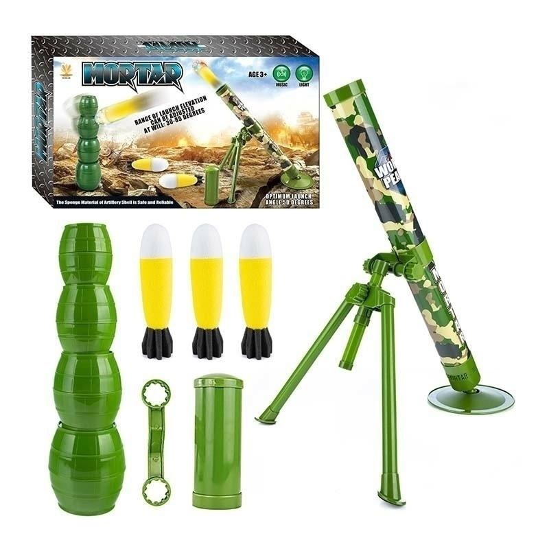 Moździerz z 3 pociskami oraz beczkami do ćwiczenia celnych strzałów. Pociski napędzane są wbudowaną sprężyną, należy najpierw przeładować pocisk (przy użyciu dołączonego narzędzia) a następnie wrzucić do lufy moździerza. Nastąpi wystrzał oraz odtworzony zostanie realistyczny dźwięk. Pociski są całkowicie bezpieczne - otoczone miękką pianką. Specyfikacja: zasilanie moździerza: 3xAG13 (LR44)1,5V Zasilanie pojedynczego pocisku: 3xAG3 (LR41)1,5V realistyczna imitacja wystrzału z moździerza dźwięki wystrzału świecące głowice pocisków system celowania przez pochylenie lufy zestaw do samodzielnego montażu wymiary pocisku: 22x5,3x5,3cm długość lufy: 60cm całkowita wysokość (zależnie od ustawienia): ok. 64,5cm maks. rozstaw nóg: 43cm W zestawie: moździerz do samodzielnego montażu klucz do montażu 3 pociski 4 beczki do ćwiczenia celności narzędzie do naciągania sprężyny w pociskach baterie Zabawka przeznaczona dla dzieci powyżej 3 roku życia. wymiary opakowania: 65,5x38x8cm Ilość szt. na palecie: 60