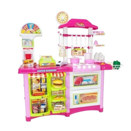 Interaktywna kuchnia z stoiskiem sklepowym. Kuchnia jest wyposażona w kuchenkę dwu palnikową, zmywarkę, mikrofalówke, zlew z kranem oraz wieszaki na akcesoria. Stoisko sklepowe posiada kasę z czytnikiem kart, czytnik kodów, półki z produktami. Dodatkową atrakcją są efekty dźwiękowe (czytnik, kasa, smażenie). Solidne wykonanie i żywa kolorystyka przyciągają uwagę dzieci. Zestaw zawiera 59 akcesoriów: czajnik x1, pokrywka czajnika x1, patelnia x1, rondelek x1, pokrywka x1, duży talerz x2, ma Zasilanie kasa 3x1,5V AA, kuchnia 3x1,5V AA, czytnik 2x1,5V AA (brak w zestawie) Waga 3kg Wymiar 87x82x30cm Zestaw do samodzielnego złożenia. Zabawka nieodpowiednia dla dzieci ponizej 36 miesiąca życia.