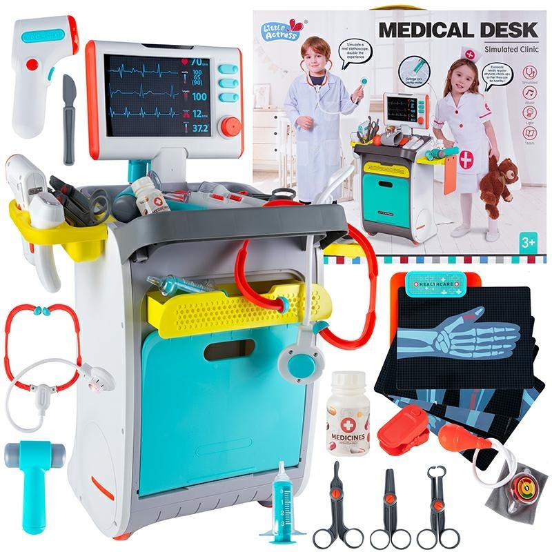 Zestaw medyczny do zabawy w lekarza lub pielęgniarkę. Zabawka posiada realistyczne wyposażenie imitujące prawdziwe urządzenia: stetoskop odtwarza dźwięk bicia serca oraz świeci, latarka, głowica do USG oraz lusterko dentystyczne posiada podświetlenie, termometr wydaje dźwięk mierzenia temperatury, podświetla się oraz ma możliwość ustawienia temperatury ciała. Wózek odtwarza realistyczne dźwięki aparatury monitorującej życie. W zestawie: 3 x nożyczki skalpel stetoskop (zasilanie 2xLR44 - w zestawie) podkładka na dane medyczne 5x zdjęcia RTG 1x tablica monitorowania parametrów życiowych (zasilanie: 2xAA - brak w zestawie) młotek lekarski strzykawka głowica do USG (zasilanie 2xLR44 - w zestawie) ciśnieniomierz lusterko dentystyczne (zasilanie 2xLR44 - w zestawie) termometr (zasilanie 3xLR44 - w zestawie) latarka diagnostyczna (zasilanie 2xLR44 - w zestawie) pojemnik na leki klips wymiary wózka (szer./gł./wys.): 42x30x65cm wymiary opakowania: 48x41x12cm Produkt zapakowany w dodatkowy karton - gotowy do wysyłki. Wymiary kartonu: 50x43x14cm Ilość szt. na palecie: 46
