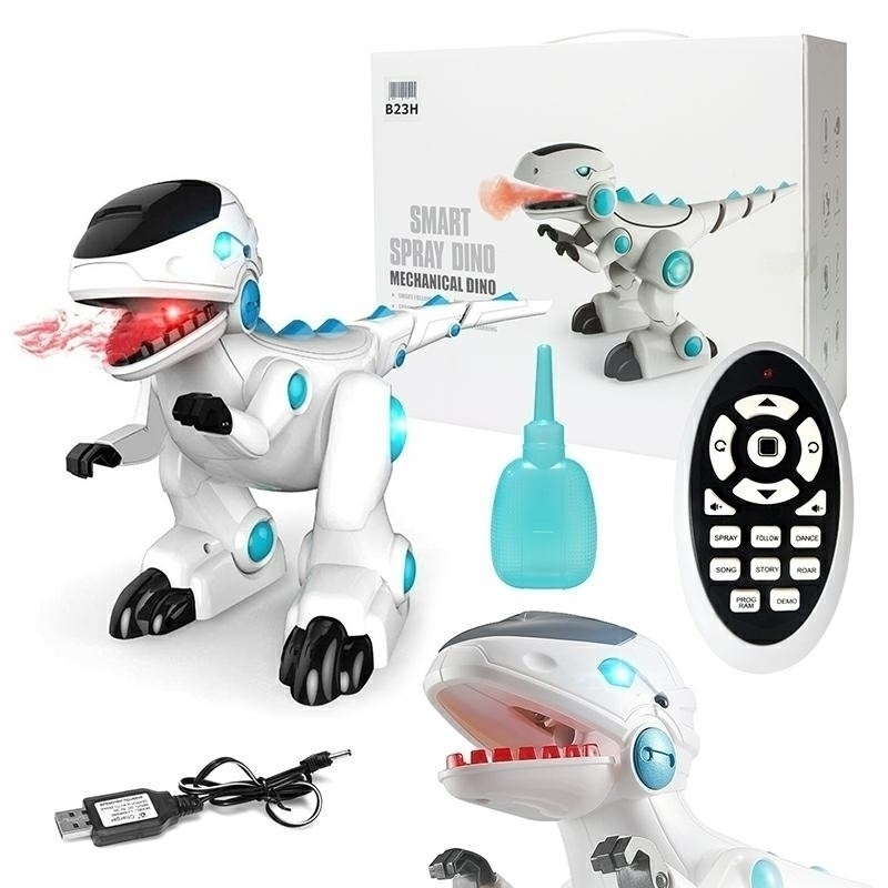 Zdalnie sterowany robot dinozaur. Funkcje mechanicznego dinozaura: -potrafi wypuszczać parę z paszczy po wybraniu odpowiedniego przycisku na pilocie (uprzednio należy wlać czystą wodę) -FOLLOW - robot podąża za ruchami pilota -śpiew i taniec -programowanie sekwencji ruchów -tryb opowiadania historii -ryk Specyfikacja techniczna: Zasilanie: akumulator 4,8V 350mAh Wymiary: 36x14x22cm Zasilanie pilota: 2xAAA (brak w zestawie) W zestawie ładowarka USB oraz dozownik do wody. Uwaga: Do napełnienia zbiornika używamy tylko czystej wody! Nie należy przekraczać zalecanego poziomu wody. wymiary opakowania: 35x29x17cm Zabawka nieodpowiednia dla dzieci poniżej 3 roku życia. - ilość szt. w kartonie: 12 - ilość szt. na palecie: 72
