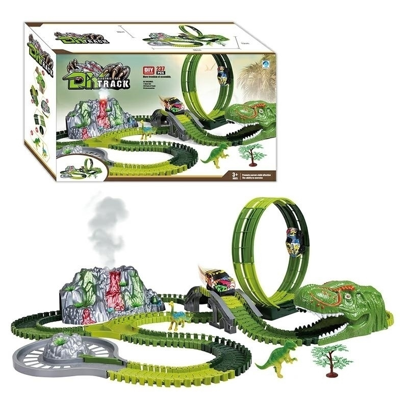 Tor wyścigowy z wulkanem Funkcje: - dymiący wulkan LED z wydobywającą się z niego parą wodną - samochód wyścigowy zasilany bateryjnie - 3 metody złożenia toru Zasilanie bateryjne: 3xAA, 2x AA Wymiary opakowania: 43x12,5x25 cm Wymiary toru: ok. 96x70x28 cm Zabawka dla dzieci powyżej 3 lat