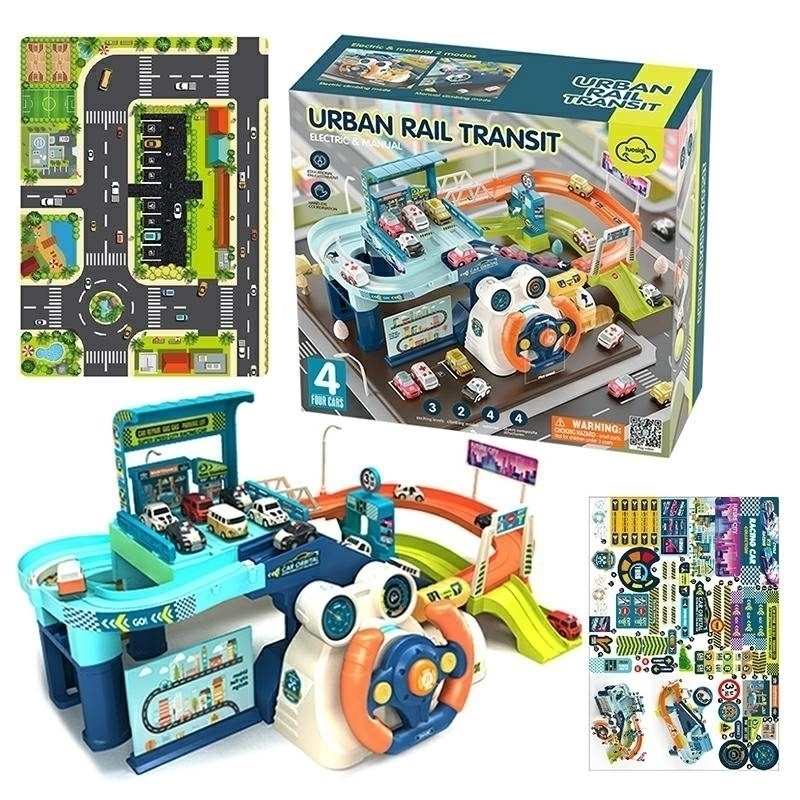 Parking samochodowy - zjeżdżalnia z mechanizmami grawitacyjnymi oraz przekładnią zasilaną ręcznie lub elektrycznie. Zabawka świeci oraz odtwarza dźwięki. Specyfikacja: zasilanie: 3xAA 1,5V (brak w zestawie) wymiary: 35x50x23cm mechanizmy mogą działać bez prądu zabawka odtwarza dźwięki kierownica - konsola sterująca W zestawie: parking - zjeżdżalnia do samodzielnego montażu 4 samochody mata pod parking - miasto z ruchem ulicznym kolorowe nakleji tematyczne wymiary opakowania: 29,5x27x12cm Zabawka przeznaczona dla dzieci powyżej 3 roku życia.