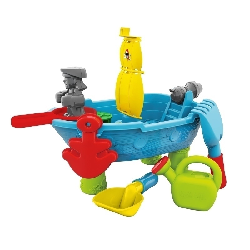 Statek Piracki plażowy zestaw 14 elementów. Zabawka idealnie nadaje się do zabawy w ogrodzie, na tarasie, balkonie czy w domu. Statek piracki składa się z łatwych do połączenia elementów. Dodatkowym elementem dołączonym do zestawu są akcesoria dekoracyjne dla pirackiego statku Pozwól swojemu dziecku poczuć się jak dzielny pirat. Skład zestawu: - solidny piracki statek na 3 stabilnych nóżkach, - foremka kotwica, - konewka, łopatka, grabki, sitko - elementy dekoracyjne statku (żagiel, pirat, armata) - 2 wirniki. Wymiary: - wysokość z nóżkami i żaglem: 29cm - długość statku 38,5 cm - szerokość 20,5 cm Zestaw zapakowany w kolorowe pudełko z praktycznym uchwytem, znakomicie nadające się na prezent.