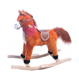 Konik na biegunach. Konik jest interaktywny -po włączeniu przycisku na uchu wydaje z siebie dźwięki (śpiewa, rży, galopuje) dodatkowo porusza mordką i macha ogonkiem ,posiada świecące serduszko. Specyfikacja: - śpiewa piosenką kowbojską, - rży i galopuje - porusza ogonkiem i mordką - posiada siodło i chustę - po bokach głowy znajdują się drewniane rączki, za które dziecko może się przytrzymać. - płozy są odpowiednio zakończone, co zapobiega nadmiernemu rozbujaniu konika. - włączniki umieszczone na uszach (zasilana bateriami 3xAA - brak w zestawie) wymiary: dł. 73cm x szer. 33cm x wys. 63cm