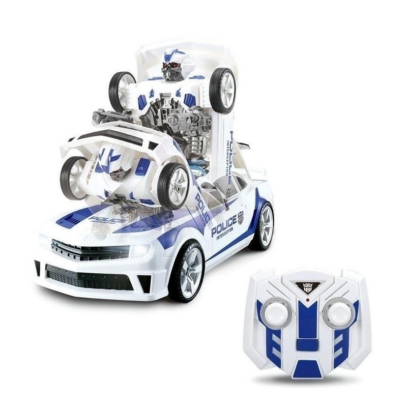 Auto-robot samochód policyjny w trakcie jazdy przekształca się w robota za pomocą pilota R\C. Pojazd jeździ do przodu, do tyłu, wykonuje drifting, przeobraża się w robota wyposażonego w pistolety. Zabawka nieodpowiednia dla dzieci ponizej 36 miesiąca życia. Cechy produktu: - efekty świetlne i dźwiękowe - realistyczne dzwięki i efekt wystrzału - tryb demo robot tańczy w rytm własnej muzyki - materiał wykonania: bezpieczne i odporne tworzywo sztuczne - zasilanie: robot- akumulator 4,8V 500mAh, pilot - 2x1,5V AA (brak w zestawie) - ładowanie robota z ładowarki USB - automatyczne przeobrażanie w robota Wymiary: - samochód: 32cm x 12cm 14cm - robot: 27cm x 25cm x 14cm - waga 0,8kg W zestawie: - auto-robot - pilot zdalnego sterownia - ładowarka USB - instrukcja w j. polskim - ilość w kartonie: 8 szt.