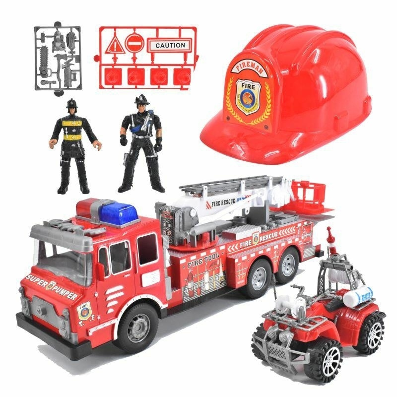 Zestaw wozu strażackiego. Wóz strażacki z napędem frykcyjnym i rozciąganą drabiną. W zestawie: - wóż strażacki (50x13x16cm) z rozkładaną drabiną(52cm) - 2 figurki strażaków (wys. 10 cm) - quad (17x12x9cm) - kask (25x17cm) - akcesoria przeciwpożarowe - akcesoria do blokad drogowych Zabawka nieodpowiednia dla dzieci poniżej 3 lat. Wymiar opakowania: 56x37x13 cm Produkt zapakowany w dodatkowy karton- gotowy do wysyłki. Ilość sztuk na palecie: 48