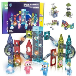 Zestaw magnetycznych klocków do budowy toru kulkowego. Część elementów zestawu posiada wbudowane oświetlenie zapewniające efektowny wygląd zabawki w ciemności. Klocki umożliwiają budowanie dowolnych konstrukcji o różnym stopniu trudności - od prostych kształtów do skomplikowanych trójwymiarowych budowli. Specyfikacja winda podnosząca kulki do góry zasilanie windy: 2xAA (brak w zestawie) zasilanie podświetlanych elementów: LR1130x3 (w zestawie) ilość elementów: 82 wymiary opakowania: 37x26x9cm Zabawka przeznaczona dla dzieci powyżej 3 roku życia.