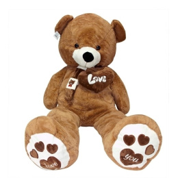 Bardzo duży pluszowy miś. Idealny na prezent dla ukochanej osoby! Wykonany z milutkiego pluszu wysokiej jakości. Idealny dla dziecka jak i dla ukochanej kobiety. Nasz miś to elegant, pod szyją ma stylowy szal a na piersi przytwierdzone duże serce z napisem Love. Na stopach wyszyty napis Love you. Cechy produktu - materiał wykonania: miękki plusz wysokiej jakości - wielkość całkowita: wysokość ~ 160cm szer : ~ 100cm - obwód głowy: ~130 cm z nosem - obwód w pasie: ~ 120cm - bardzo miękkie wypełnienie - kolor: brązowy - ilość w kartonie: 4szt waga:4,5kg Zabawka nieodpowiednia dla dzieci poniżej 3 roku życia.
