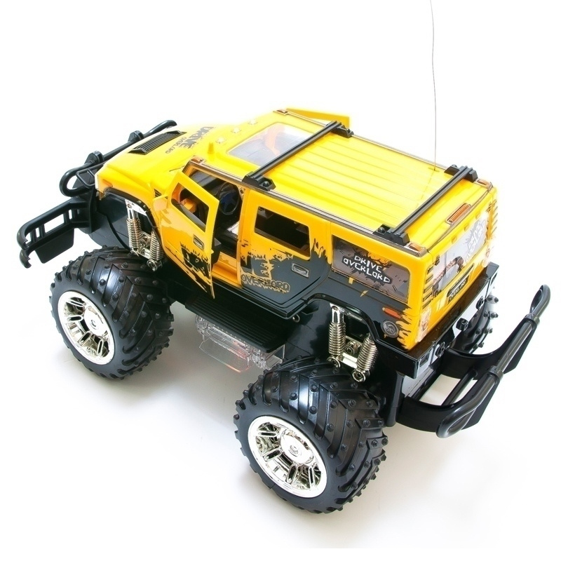 Terenowy pojazd zdalnie sterowany Hummer R/C 1:14, długość 34 cm. Otwierane drzwi, wejście MP3, wielofunkcyjny pilot. Zabawka podświetlana bocznymi diodami LED po 1 na każdym z kół. Dodatkowo, podczas jazdy świecą się reflektory z przodu oraz światła tylne. W zestawie: - samochód R/C - ładowarka - pilot zdalnego sterowania - bateria