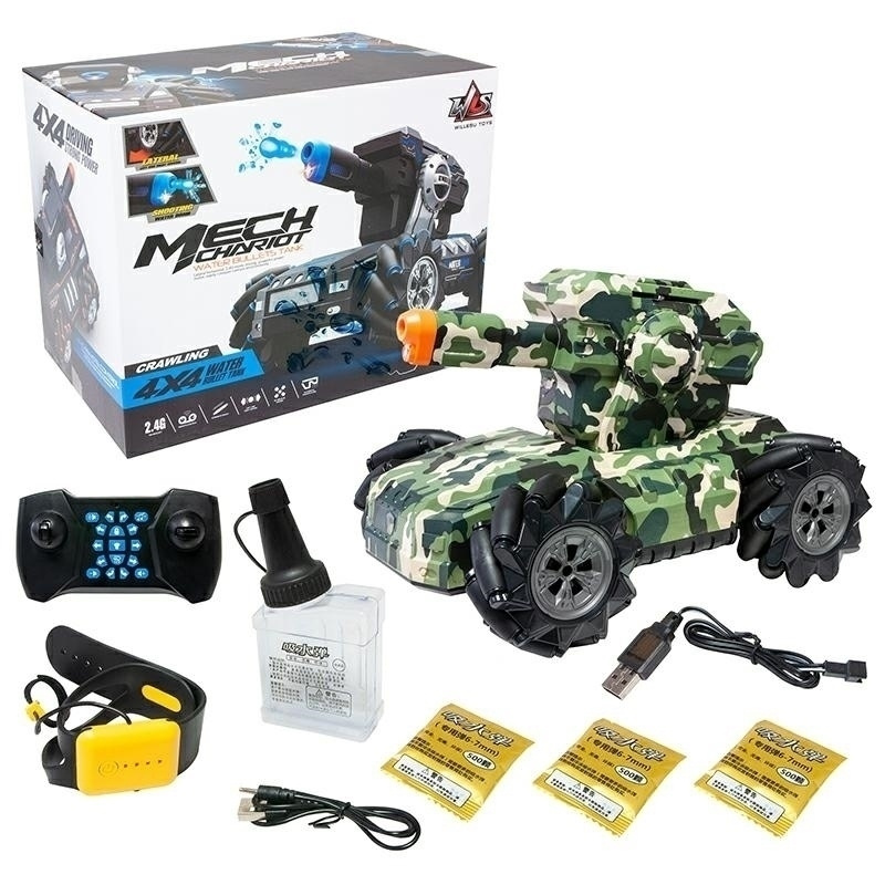 Zwrotny zdalnie sterowany czołg wyposażony w działko na kulki wodne. Samochód posiada specjalne rolki w kołach, które umożliwiają mu jazdę na boki oraz zawracanie w miejscu. Cechy produktu: - 2 piloty zdalnego sterowania - tradycyjny oraz naręczny do sterowania gestami - koła wyposażone w ruchome rolki - tryb programowania sekwencji ruchów - funkcja driftu taktycznego- zawracanie w miejscu oraz jazda we wszystkich kierunkach - działko strzelające wodnymi kulkami - magazynek na amunicję - strzelanie serią oraz pojedynczo - zasilanie pojazdu: akumulator 1300mAh - zasilanie pilota : 2xAA (brak w zestawie) - zasilanie kontrolera naręcznego: akumulator - napęd 4x4 - dźwięki oraz światła - czas jazdy: 25min - czas ładowania: 180min - wymiary pojazdu: 27x18x19cm W zestawie: - czołg z armatką - 2 piloty zdalnego sterowania - 2 ładowarki USB (do kontrolera naręcznego oraz pojazdu) - magazynek - dozownik na kulki wodne - 3 saszetki z amunicją wodną Zabawka nieodpowiednia dla dzieci poniżej 8 roku życia. Ilość szt. w kartonie: 16 Ilość szt. na palecie: 96