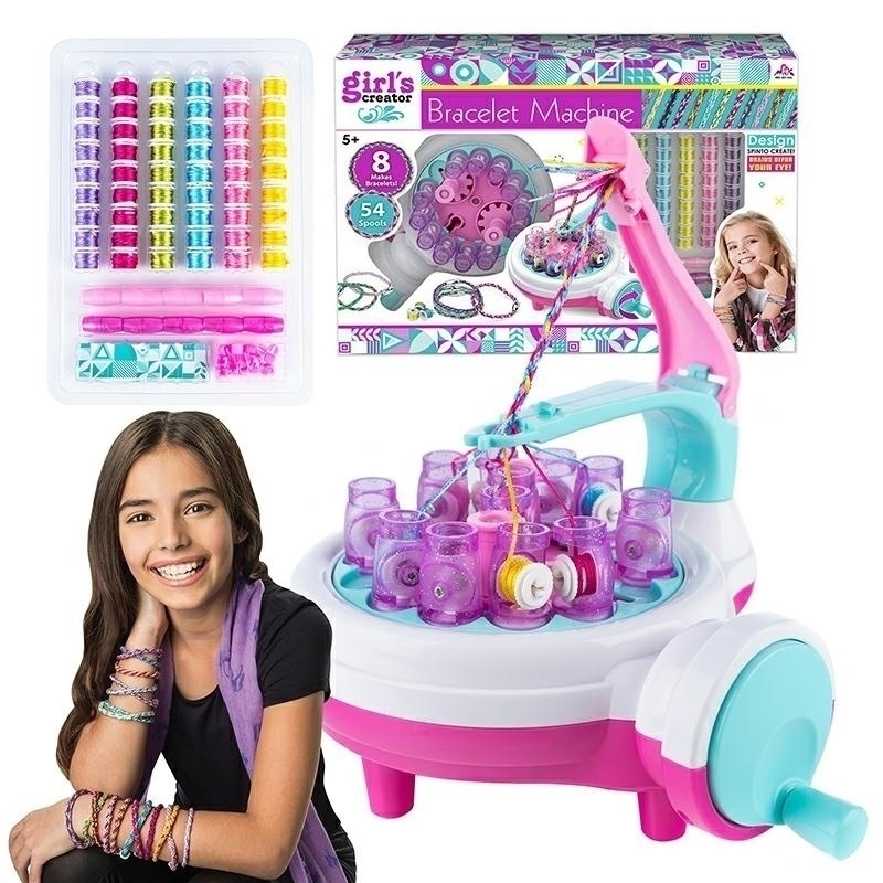Zestaw do samodzielnego zaplatania bransoletek. Dzięki kolorowej mulinie oraz zapięciom stworzysz własną niepowtarzalną biżuterię! Urządzenie nie wymaga zasilania. W zestawie: - 54 szpule muliny w 6 kolorach - 10 zapięć - miarka - maszynka do zaplatania - czytelna instrukcja zaplatania bransoletek Zabawka przeznaczona dla dzieci powyżej 3 roku życia. wymiary maszynki: 22x19x15cm wymiary opakowania: 44x31x11cm Ilość szt. na palecie: 80