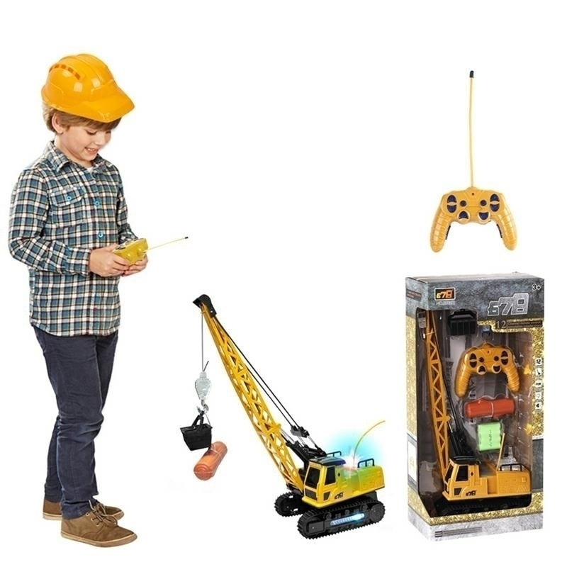 Zdalnie sterowany wysokiej jakości duży model dźwigu. Dźwig obraca się oraz opuszcza na linie hak, na który można zaczepić akcesoria z zestawu czyli bal drewna lub pojemnik na materiały budowlane. Szczegółowe wykonanie i duża ilość detali zapewni mnóstwo zabawy. Dzięki gąsienicowemu napędowi, żuraw może poruszać się w trudnym terenie. Cechy produktu: - efekty dźwiękowe oraz świetlne - zasilanie pilota: 2xAA - zasilanie dźwigu: akumulator 4,8V 300mAh - funkcje pilota: obrót kabiny L/R, podnoszenie i opuszczanie haka, jazda dźwigiem w przód tył oraz na boki - wymiary: 13x21x49cm W zestawie: - dźwig - 1x bal drewna do podnoszenia - 1 x pojemnik do podnoszenia - kabel USB do ładowania wymiary opakowania: 52x25x16 cm Produkt pakowany w dodatkowy karton: 53,5x26,5x18 cm Zabawka przeznaczona dla dzieci powyżej 3 roku życia. Ilość szt. w kartonie: 12 ilość na palecie 50 szt.