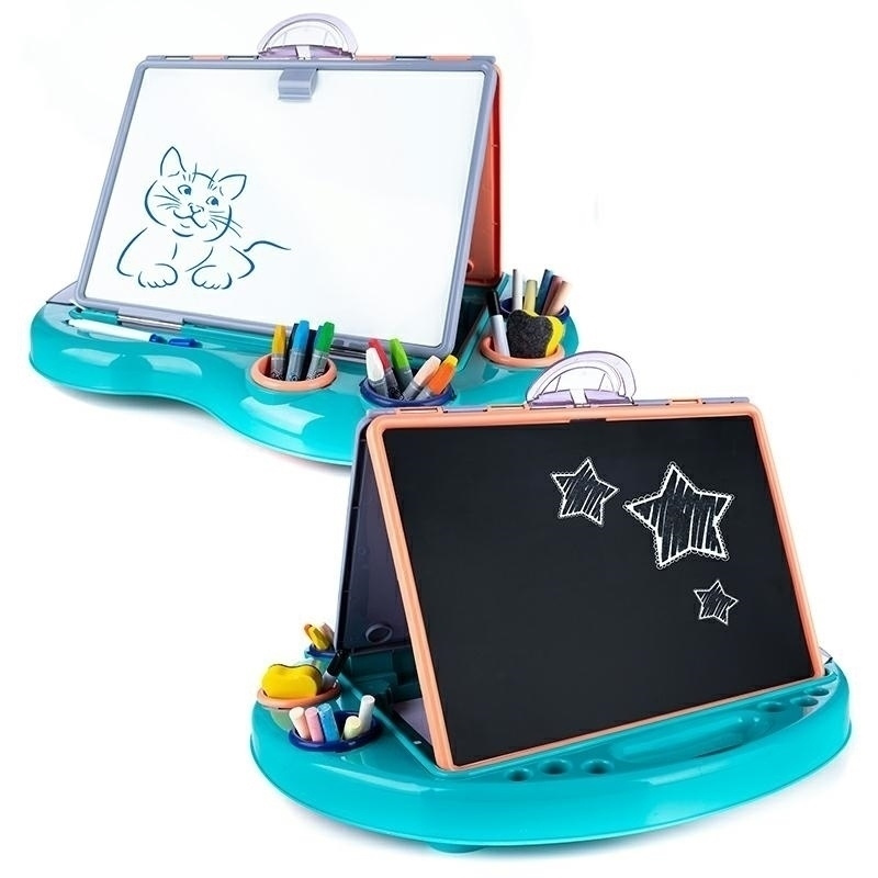 Stolik do malowania oraz rysowania z 2 tablicami i możliwością przymocowania kartek A4. Specyfikacja: praktyczny stolik z miejscami do przechowywania przyborów do rysowania/malowania po złożeniu zajmuje niewiele miejsca klips do zawieszenia kartki papieru 2 tablice - biała suchościeralna oraz czarna tradycyjna 4 kubeczki do przechowywania artykułów papierniczych wymiary rozłożonej tablicy: 47x39x30cm przekątna samej tablicy: 36cm W zestawie: 5 kolorowych kred 4 kolorowe mazaki suchościeralne 12 kolorowych pasteli olejnych gąbka do ścierania tablicy 20 arkuszy papieru w formacie A4 Wymiary opakowania: 49,5x41x7cm Zabawka przeznaczona dla dzieci powyżej 3 roku życia. Ilość szt. na palecie: 72