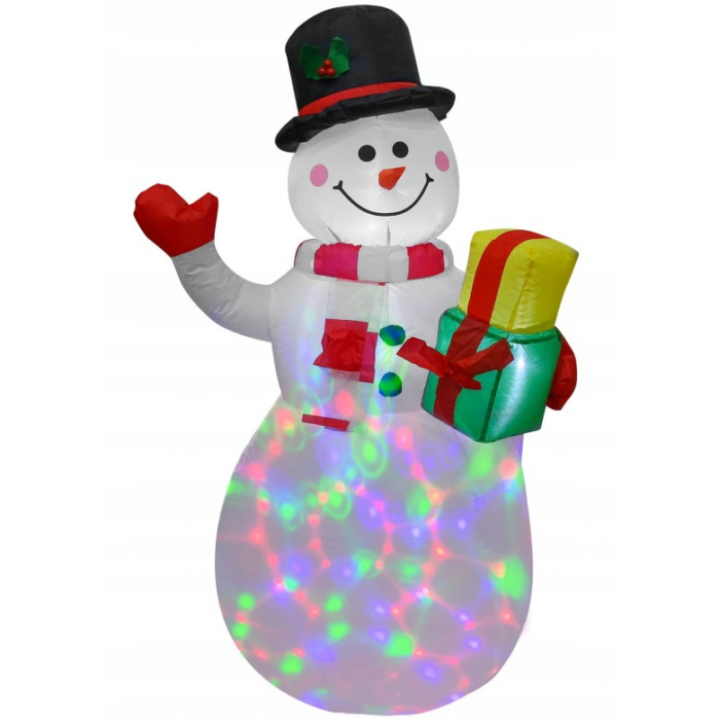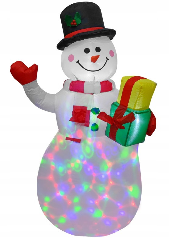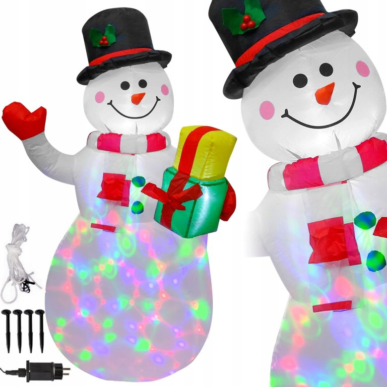BAŁWAN z prezentem - DUŻY 150 cm z podświetleniem LED E-943599 Dekoracyjny bałwan z oświetleniem LED, który będzie się pięknie prezentował w każdym ogrodzie. Podkreśli świąteczną atmosferę oraz przyciągnie wzrok. Wysokość: 150 cm Szerokość: 80 cm (w najszerszym punkcie) PIĘKNA OZDOBA - IDEALNY POMYSŁ NA PREZENT Samo nadmuchująca dekoracja świąteczna (pompka wbudowana) Diody LED podświetlające ozdobę - wbudowane wewnątrz Materiał odporny na warunki atmosferyczne Klasa szczelności -  IP44 Długość przewodu zasilającego: 2 m Napięcie: 230V / 50Hz WBUDOWANY KOMPRESOR I OBROTOWY PROJEKTOR LED Bałwanek posiada wbudowany kompresor, który napełnia go powietrzem. Dodatkowo dekoracja ma wbudowany obrotowy projektor LED, który podświetla go od środka. Po zmroku bałwanek mieni się wieloma kolorami. SKŁAD ZESTAWU 4 śledzie 2 linki 2 worki na obciążenie Bałwanek został wyposażony w dwie parciane pętelki umiejscowione na wysokości pasa, które służą do ustabilizowania figury, za pomocą 4 śledzi rozpiętych na 2 linkach. Dodatkowym dociążeniem świecącego bałwana są 2 woreczki, które można wyposażyć w obciążenie i umiejscowić wewnątrz figurki. ODPORNY NA WARUNKI ATMOSFERYCZNE Dekoracja jest wyposażona w zasilacz, który posiada klasę szczelności IP44.