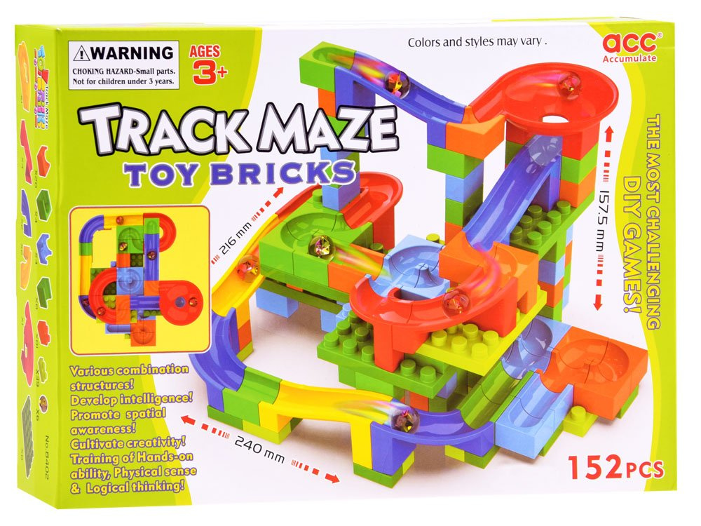 Das Set besteht aus 152 Teilen, mit denen man verschiedene Kombinationen von Kugelbahnen bauen kann. Das Kind kann selbst entscheiden, wie die Struktur aussehen soll.