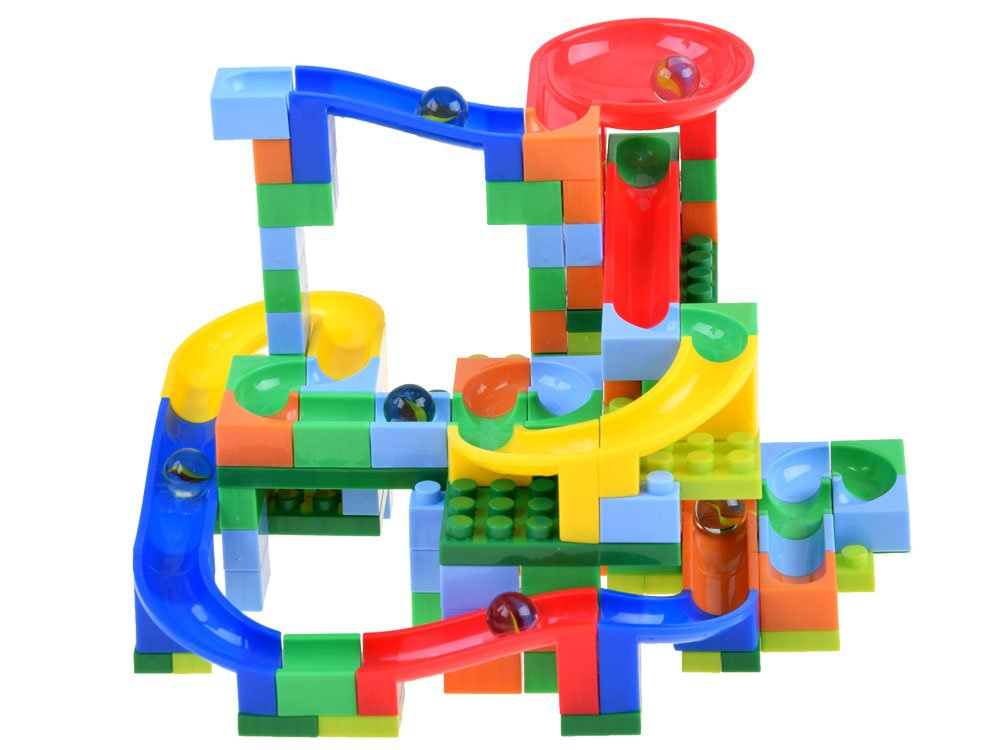 Das Set enthält Würfel in verschiedenen Formen und Farben, aus denen sich eine gebogene Kugelbahn bauen lässt.