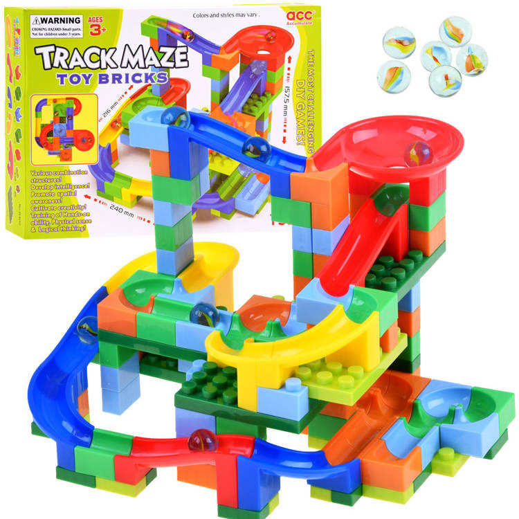 Diefarbenfrohe Bahn, auf der sichdie Kugeln aus den Klötzen selbst aufbauen können, ist eine Wahl für jedes Kind. Die Datei besteht aus 152 Elementen.