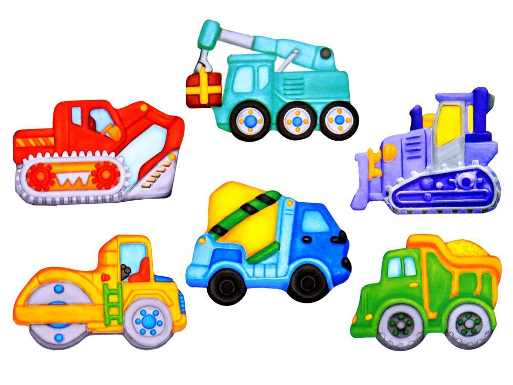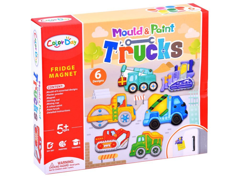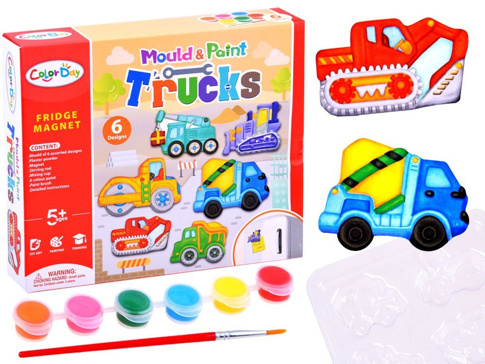 Ein tolles Set zum kreativen Spielen, mit dem man Kühlschrankmagnete in Form von Baufahrzeugen herstellen kann: Bulldozer, Kran, Betonmischer, Walze, Bagger und LKW.