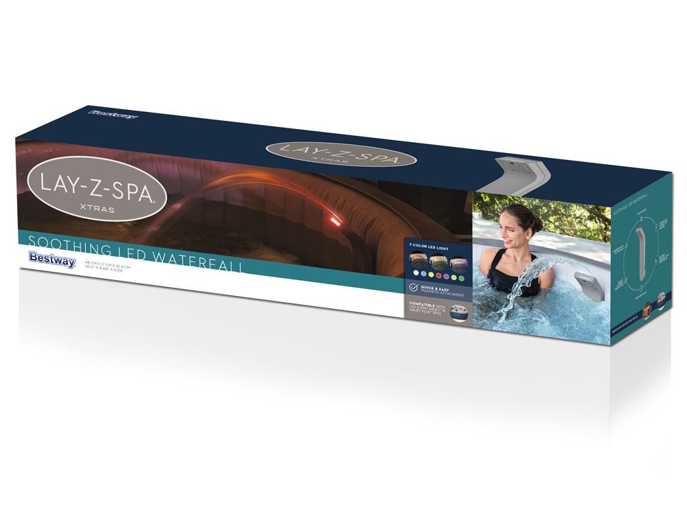 DerLED-Wasserfall LAY-Z-SPA ist der Vorschlag von Bestway für den kommenden Sommer!Der Wasserfall sorgt für Freude und Entspannung in Ihrem Garten-Spa. Der Wasserfall ist einfach zu bedienen und mit allen Bestway AirJet und AirJet Plus Whirlpools kompatibel.Die Kaskade verfügt über ein eingebautes LED-Licht, das mit 3 AAA-Batterien (nicht im Lieferumfang enthalten) betrieben wird und die Badewanne beleuchtet und eine stimmungsvolle Atmosphäre beim abendlichen Bad schafft.Nichts löst eine solche Welle der Ruhe und Entspannung aus wie das beruhigende Rauschen eines Wasserfalls. Seine schlanke und elegante Form sorgt für einen glatten und glasklaren Wasserstrahl und ist einfach zu bedienen und langlebig. Mit einer faszinierenden Reihe von Lichtern können Sie fast jede Schattierung des Regenbogens genießen, wenn die Show beginnt. Wählen Sie aus sieben monochromen Modi oder einem schillernden Wechselmodus und genießen Sie die Entspannung. Um Geld zu sparen, ist die Leuchte mit einer automatischen Abschaltfunktion nach 2 Stunden Betrieb ausgestattet, was die Lebensdauer von Batterie und Glühbirne schont.Dank der Wasserdichtheitsklasse IP66 ist die LED-Lampe gegen starke Wasserströmungen und den alltäglichen Staub geschützt, so dass Sie die entspannende Atmosphäre, die dieses Accessoire schafft, viele Jahre lang genießen können. Einfach die Batterien einlegen, den Wasserfall dank des praktischen Magnetbefestigungssystems an der Badewannenwand befestigen und das Farblicht per Knopfdruck aktivieren.