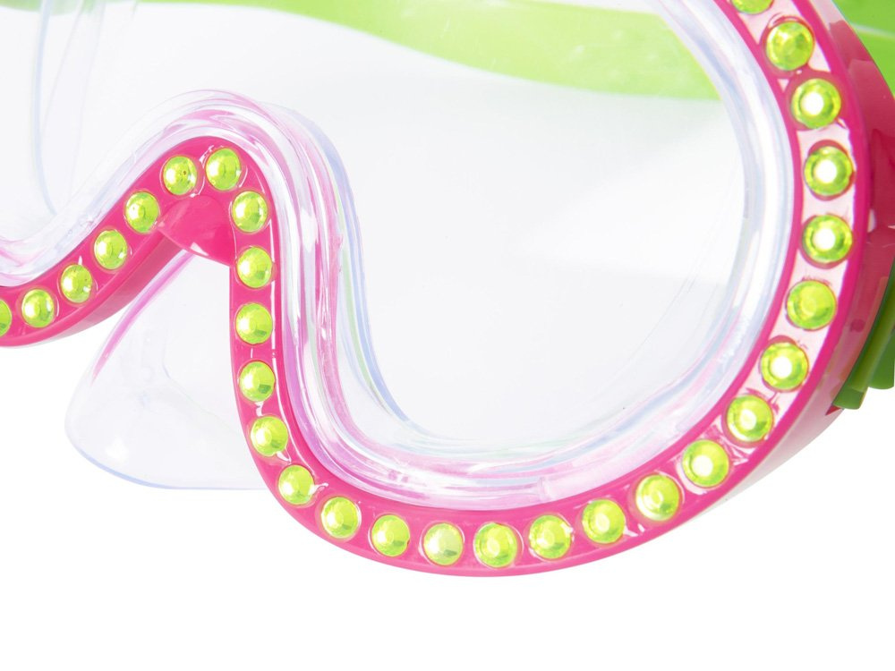 Das voll verstellbare Kopfband und der doppelt abgedichtete Kragen garantieren optimalen Tragekomfort. Darüber hinaus verfügt die Brille über Gläser mit einem UV-Filter aus Polycarbonat. Das Ganze ist mit glitzernden, eingebetteten Glitzersteinen verziert. Die Brille ist für Kinder ab 7 Jahren geeignet. Das Band lässt sich vollständig einstellen, so dass sich die Maske perfekt an den Kopf des Kindes anpasst.