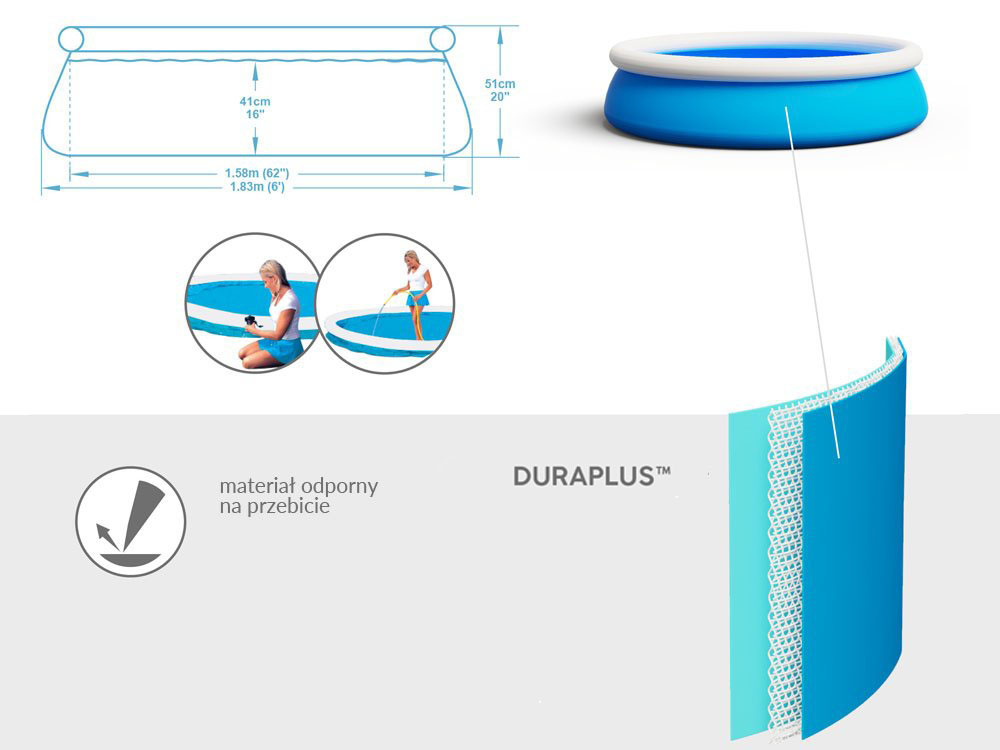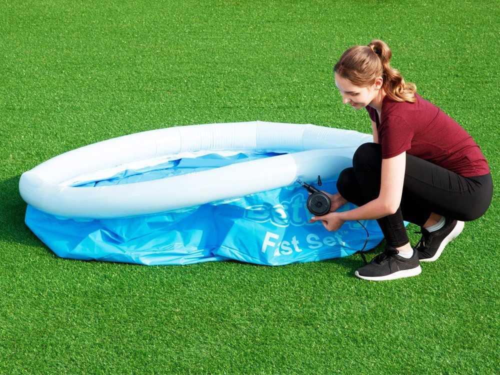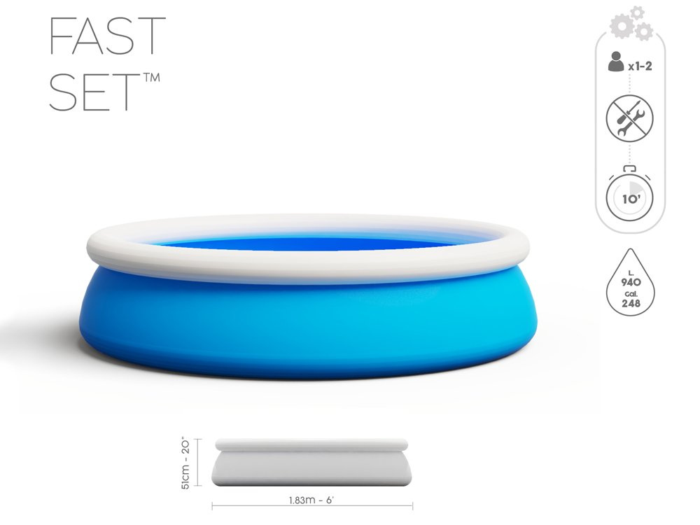 Die Fast Set-Serie der freistehenden Pools zeichnet sich durch ihre extrem einfache Installation aus - die Poolwannen werden einfach auf eine feste, ebene Fläche gestellt, der Rand aufgeblasen und mit Wasser gefüllt. Die Konstruktion der Wände ermöglicht es, die Höhe des Beckens je nach Wasserstand anzupassen. Dadurch ist es möglich, das Becken in verschiedenen Tiefen zu nutzen.Bei diesem Modell können bis zu 80 % des Tankvolumens mit Wasser gefüllt werden.