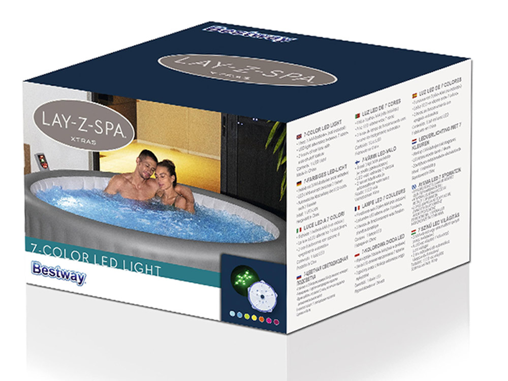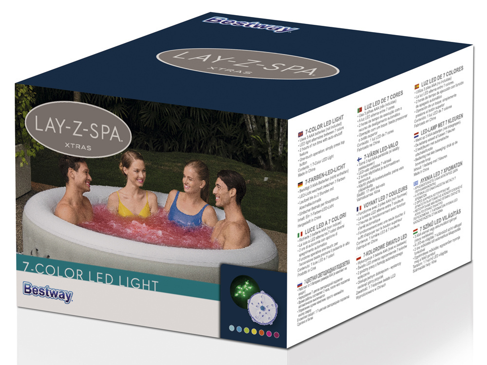 Die LED-Lampe ist ein tolles Accessoire für einen romantischen Abend im Lay-Z-Spa Garten. Es ist einfach zu bedienen und verfügt über bis zu sieben Farbmodi. die Farben werden mit der oberen Taste umgeschaltet. Die Leuchte ist absolut sicher und wasserdicht und wird mit 3xAAA-Batterien betrieben.
