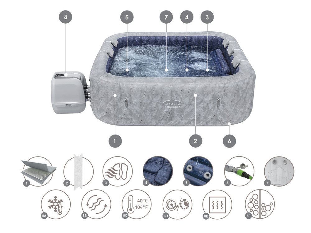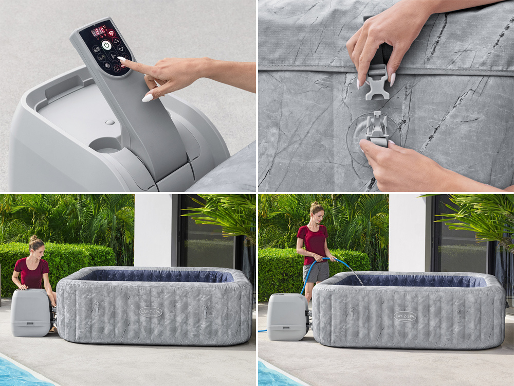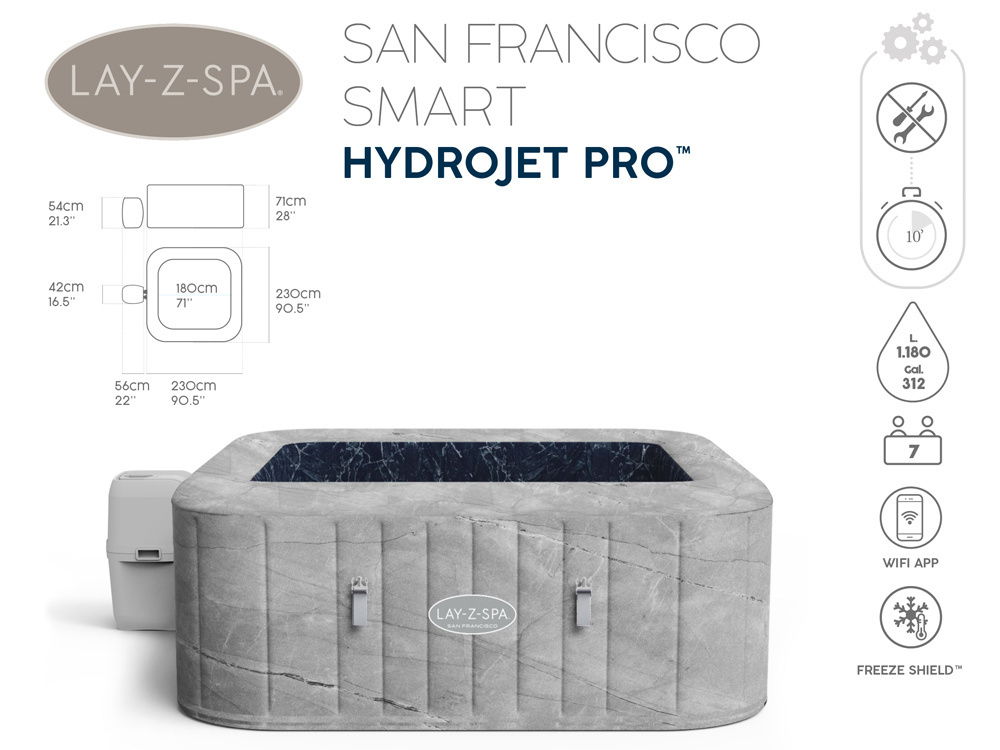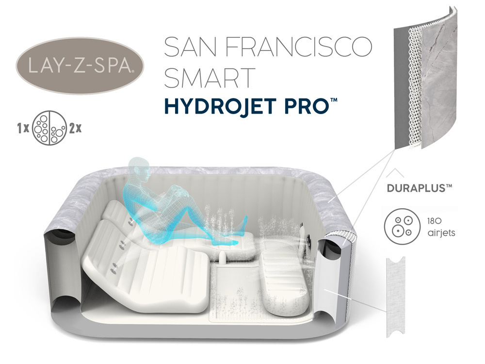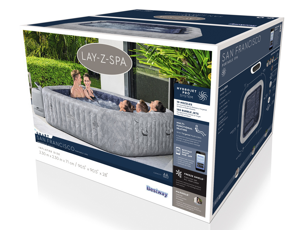 Das neueste Angebot von Bestway, der Lay-Z-Spa San Francisco, ist ein tragbarer Whirlpool, in dem Sie sich wie im ultimativen Spa fühlen können, direkt in Ihrem eigenen Garten. Es ist für diejenigen geeignet, die einen luxuriösen Urlaub in Privatsphäre schätzen. Ganz gleich, ob Sie nach einem langen Tag entspannen, einen romantischen Abend mit Ihrem Liebsten verbringen oder sich mit Freunden oder Kindern erholen möchten, das Modell San Francisco wird Ihnen dabei behilflich sein.