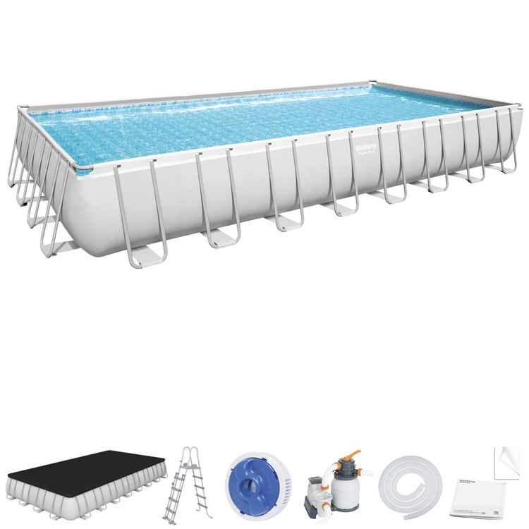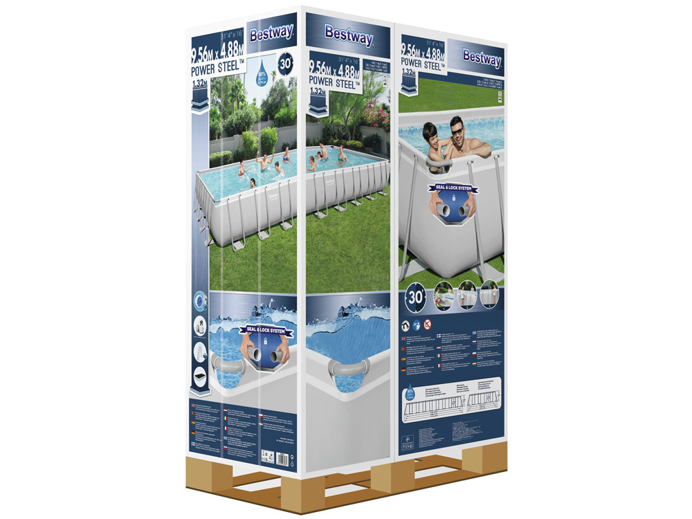 Mit beeindruckenden Maßen von 956 x 488 x 132 cm und einem Volumen von 52.231 l sorgt der Bestway POWER STEEL™ Shelf Garden Pool für Abkühlung an heißen Tagen. Dank der Größe und Tiefe des Beckens werden sich sowohl Kinder als auch Erwachsene darin wohlfühlen. Die wichtigsten Merkmale des Pools:
