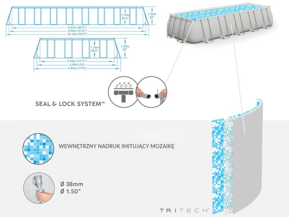 Die Poolwanne besteht aus Tritech™-Material, einer Kombination aus Polyestergewebe und zwei Schichten aus dickem PVC. Tritech™ garantiert die Haltbarkeit und Langlebigkeit des Pools für viele Jahreszeiten.