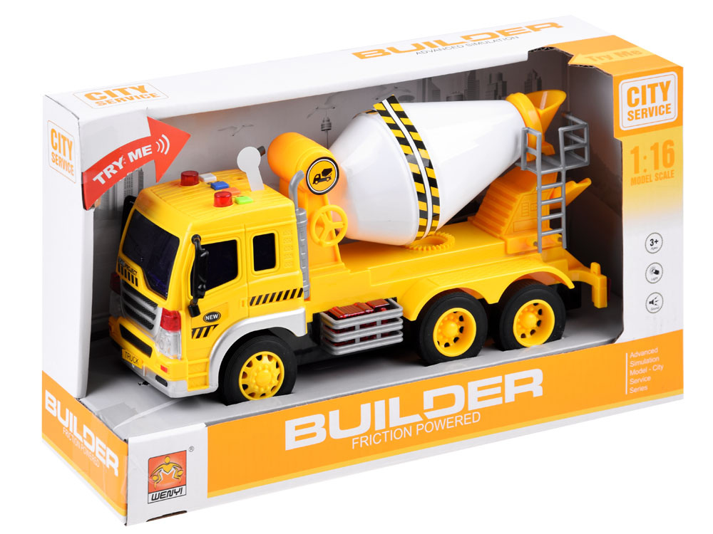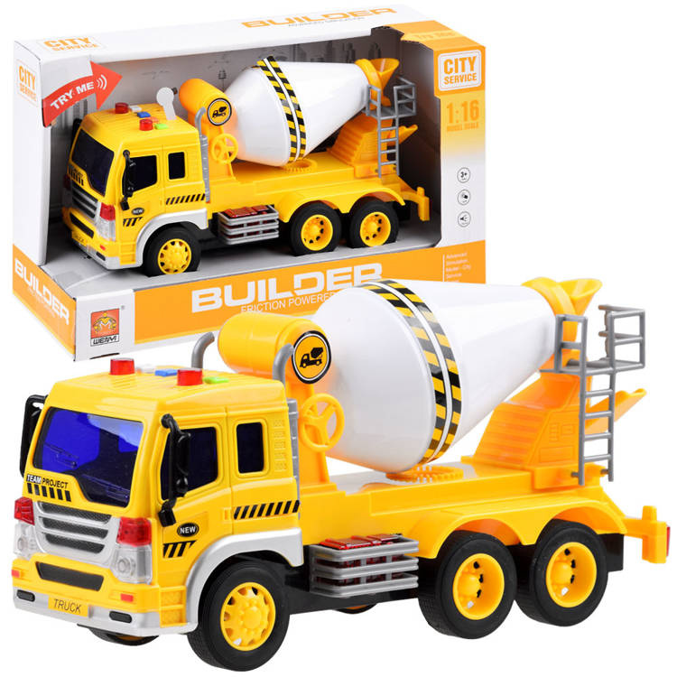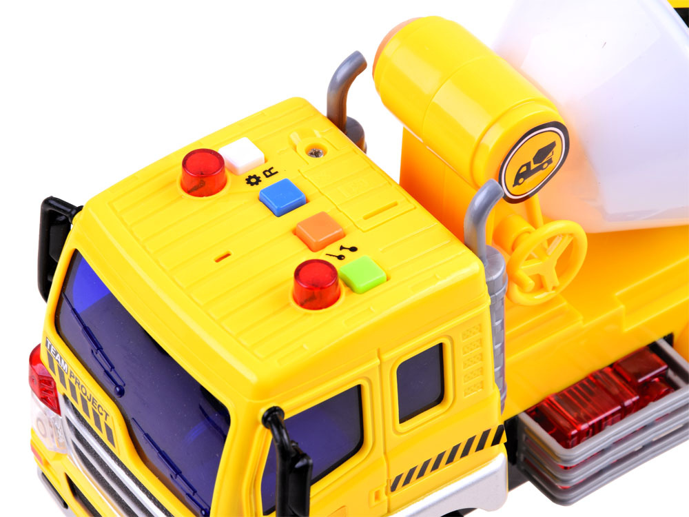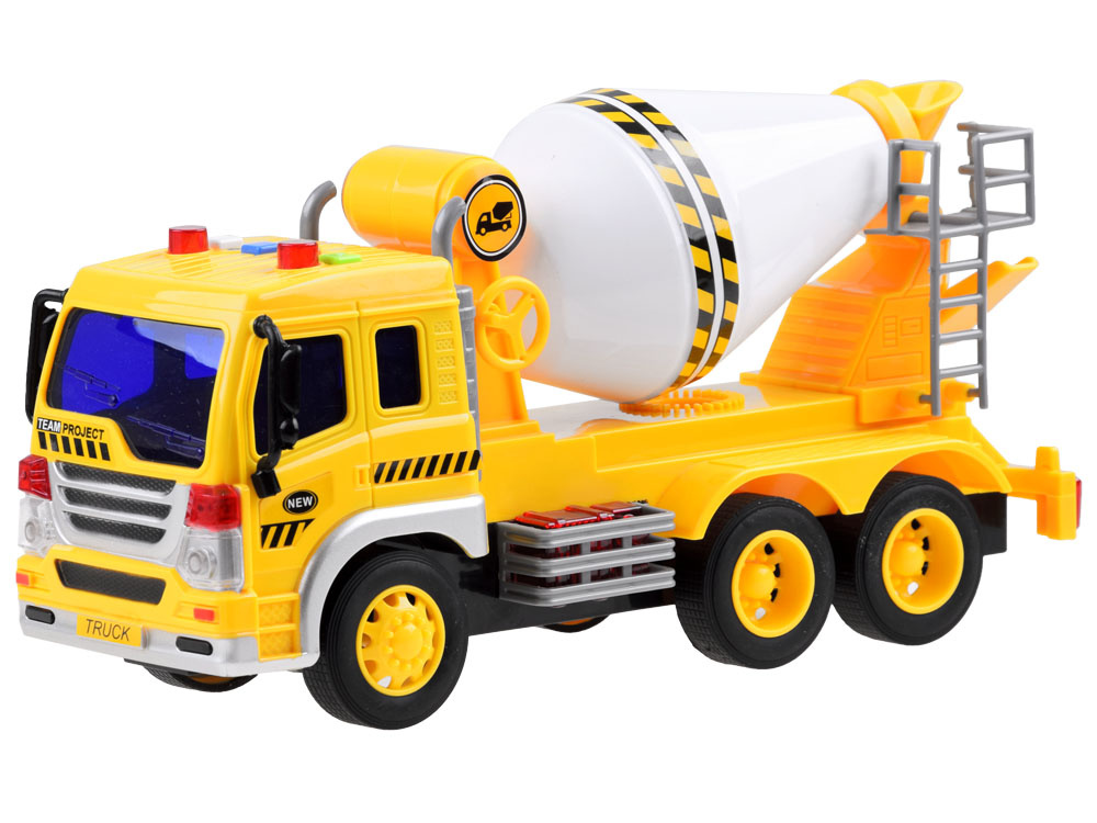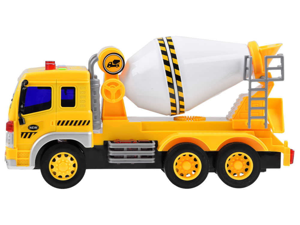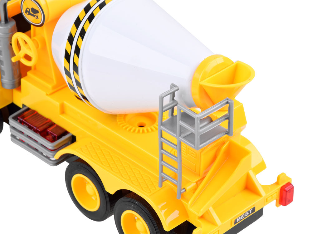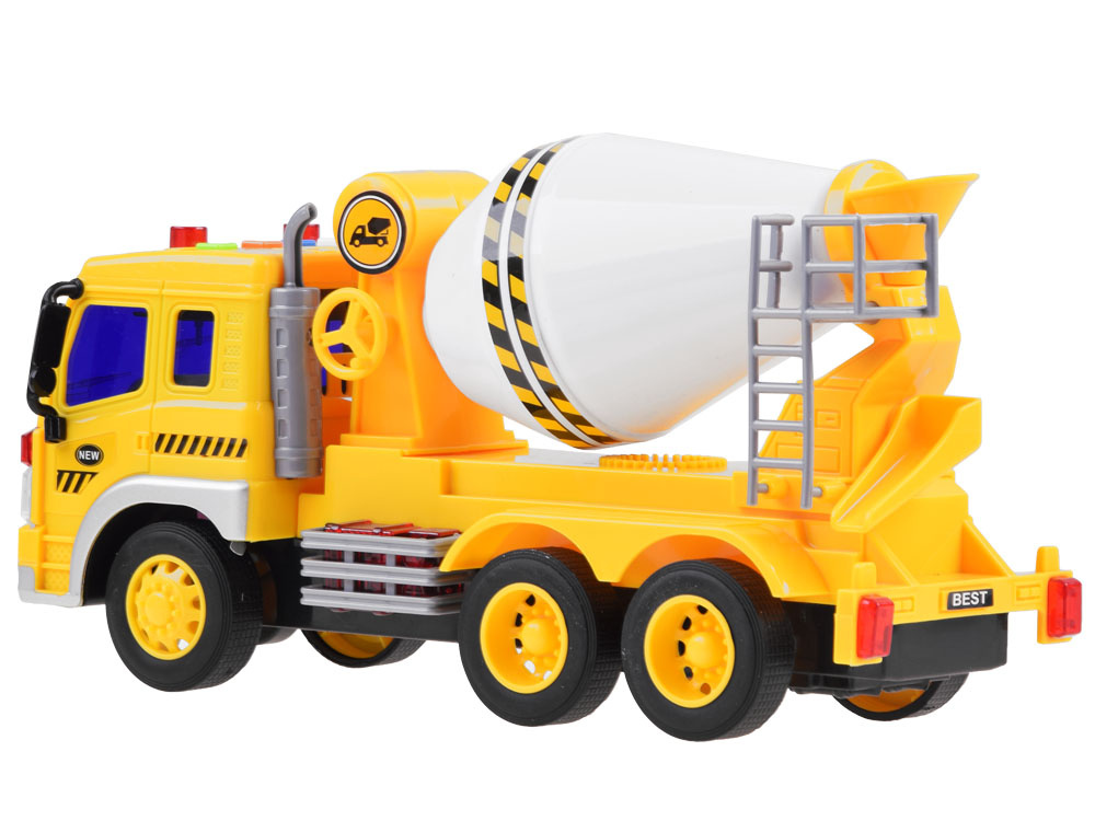 Betonmischer-Baufahrzeug, das auf jeder Baustelle benötigt wird.Super Auto für großen Spaß für Ihr Kind. Betonmischer, sogenannte. die Birne ist ein robustes Fahrzeug mit einem schwenkbaren Lauf. Der Lauf wird durch eine Kurbel gedreht. Das Ganze zeichnet sich durch ein sehr gutes Design und eine leichte Lenkung aus. Das Produkt ist aus hochwertigem Kunststoff hergestellt.Das Auto zeichnet sich durch sein modernes Design, die Liebe zum Detail und die passende Farbgestaltung aus. Das Set ist ideal zum Spielen zu Hause, im Garten oder im Sandkasten und eignet sich für Kinder ab 3 Jahren. Die größte Attraktion des Fahrzeugs sind die realistischen Geräusche, die man hört, wenn man die Knöpfe auf dem Dach der Betonmischerkabine drückt.