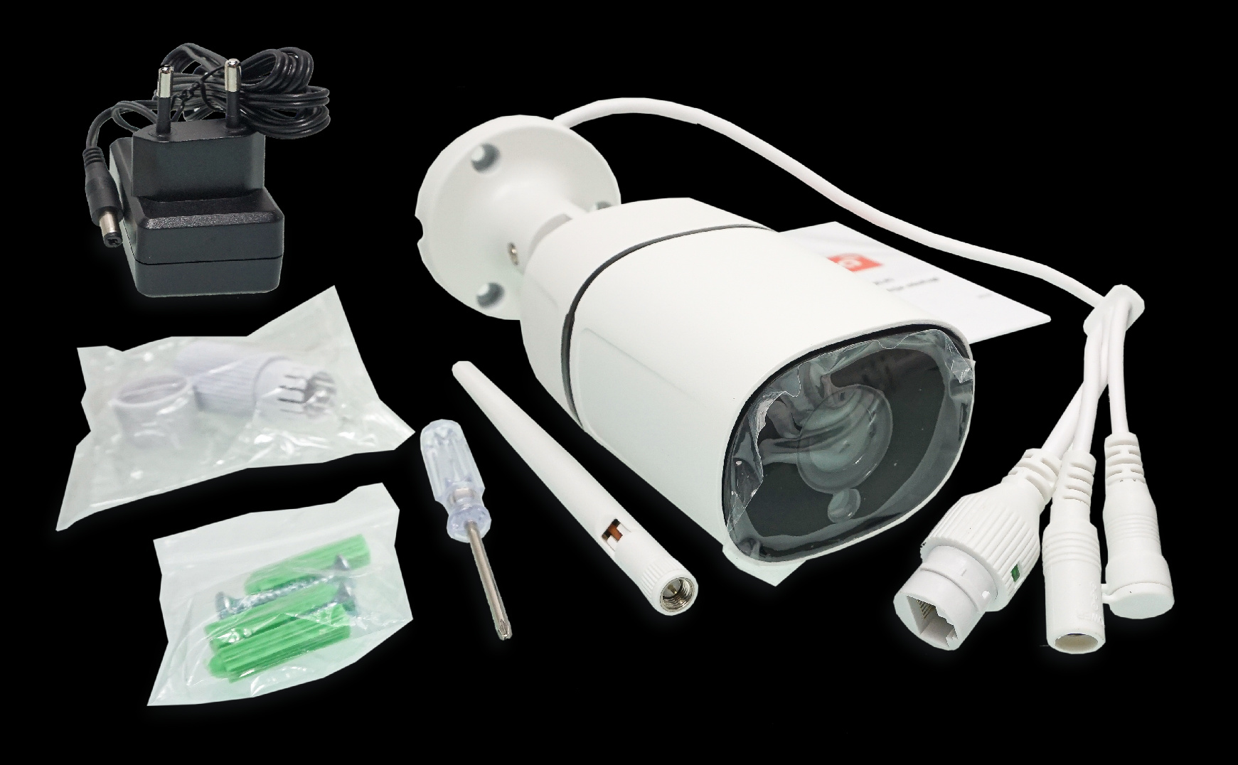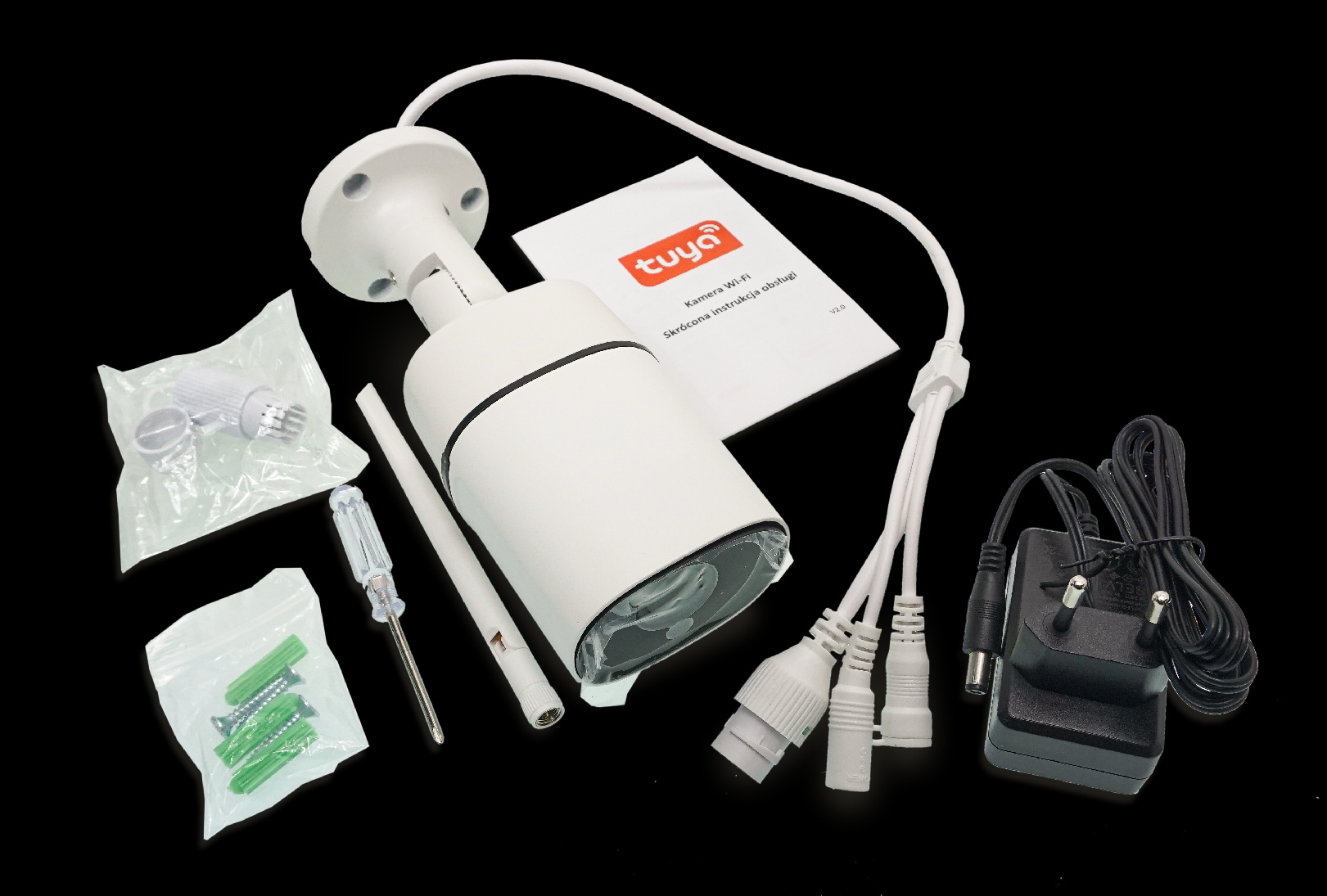 Instalační sada: napájecí zdroj, USB kabel, instalační kolíky, instalační šablona, šroubovák.